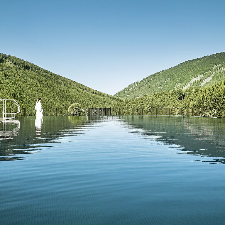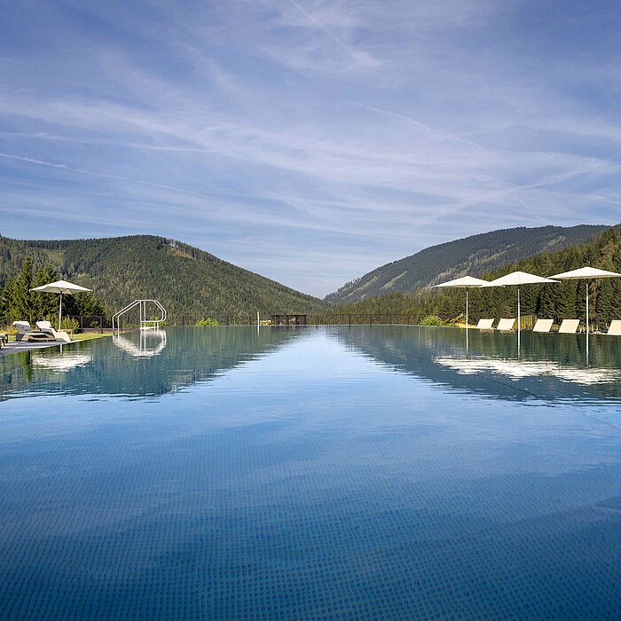 Malerisches Bergpanorama, einzigartige Almlandschaft – diesen Ausblick genießen Sie von unserem großzügigen Infinity-Pool heraus. Ziehen Sie auf ganzjährig beheizten 20 x 8 Metern Ihre Bahnen an der frischen Luft oder entspannen Sie Körper und Geist im Wasser. Egal ob im Sommer oder im Winter, denn in unserem Hotel mit beheiztem Außenpool im Herzen Österreichs ist das Wasser immer angenehm warm.
